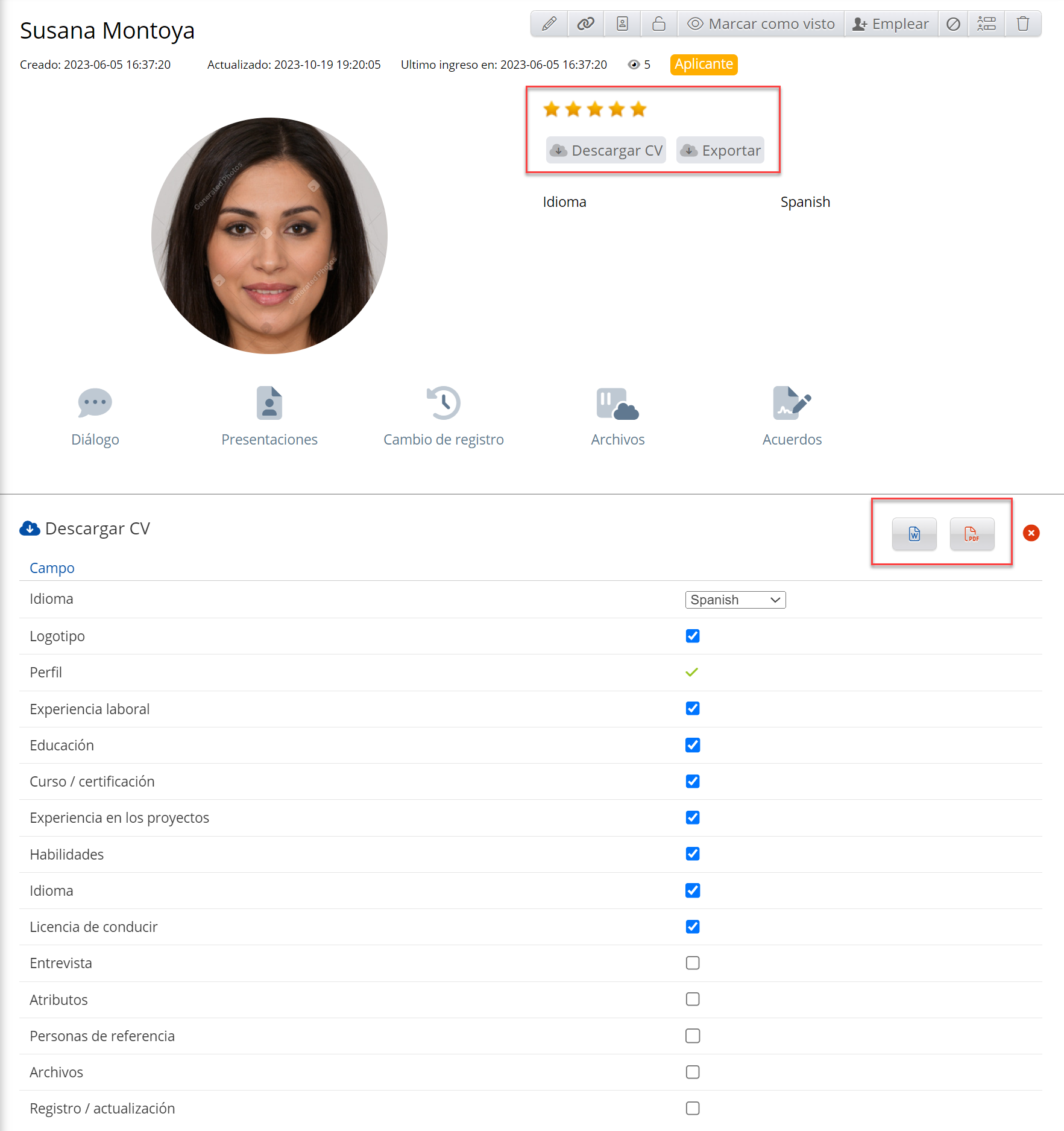 Descargar CV extraerá el perfil del candidato como un archivo PDF o Word, mientras que Exportar realiza la acción correspondiente pero a un archivo JSON. Al presionar cualquiera de los botones, se le presentarán las siguientes opciones, que puede elegir incluir o no: