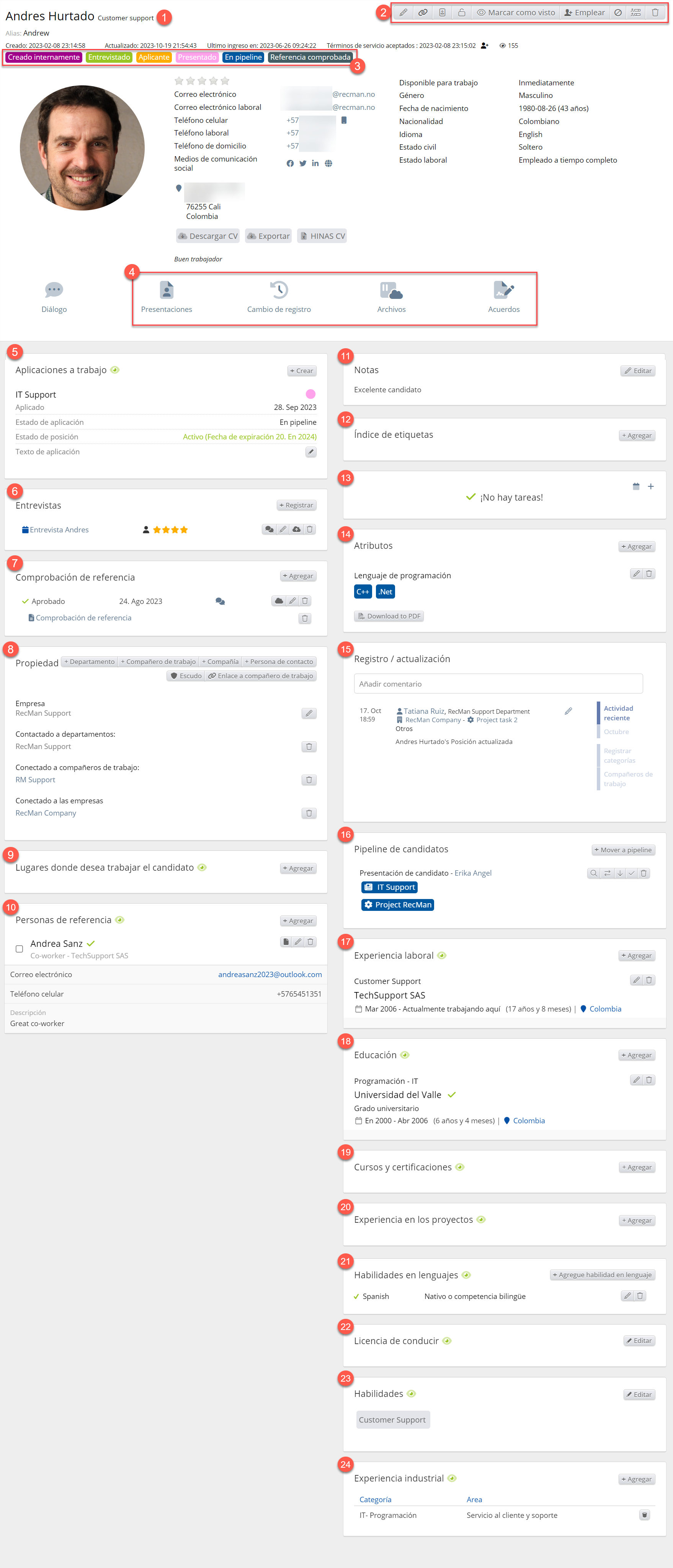 23. Habilidades: habilidades que tiene el candidato. Estos pueden ser verificados y clasificados del 1 al 5 por competencia.
