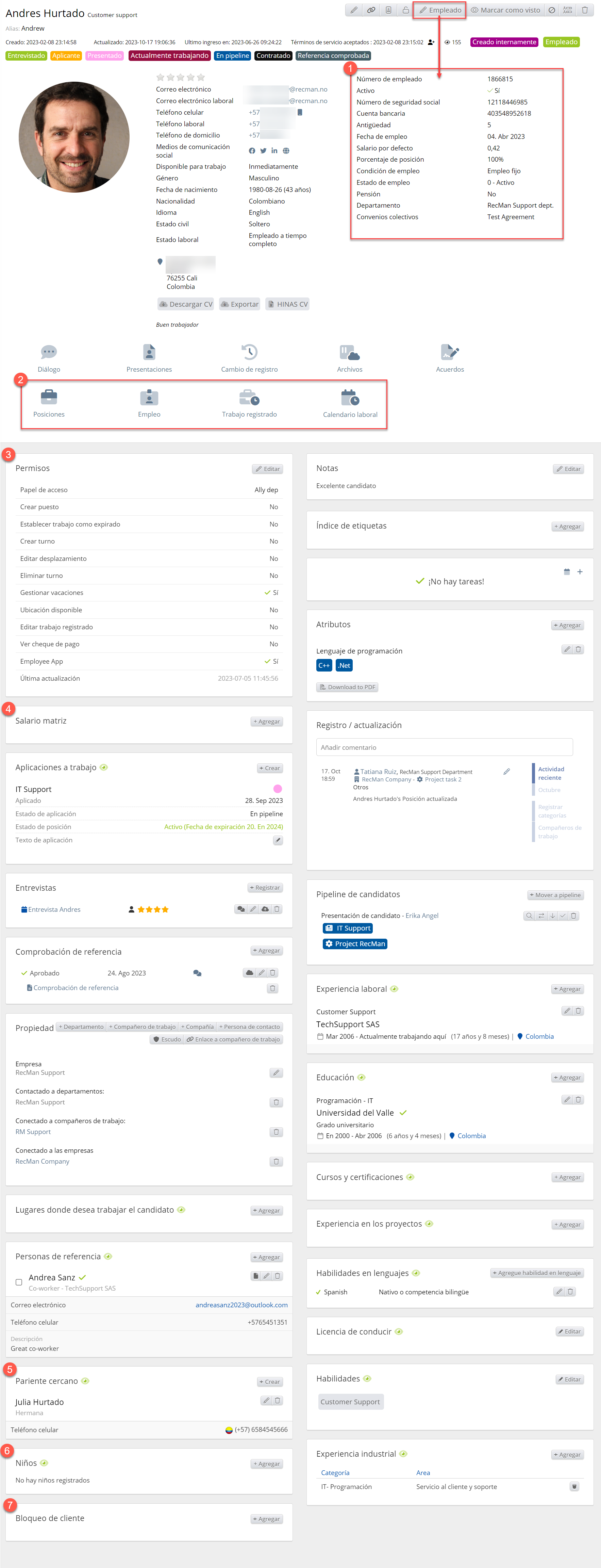 Tenga en cuenta que la tarjeta de candidato tendrá un aspecto diferente dependiendo de si se trata de un candidato o de un candidato aprobado para la contratación de personal, también conocido como Empleados. Los empleados tendrán más campos disponibles en su perfil. Además, se pueden activar más campos en la configuración de candidatos. A continuación, puede ver cómo se vería la tarjeta de candidato con explicaciones para cada campo, así como la variación del empleado.