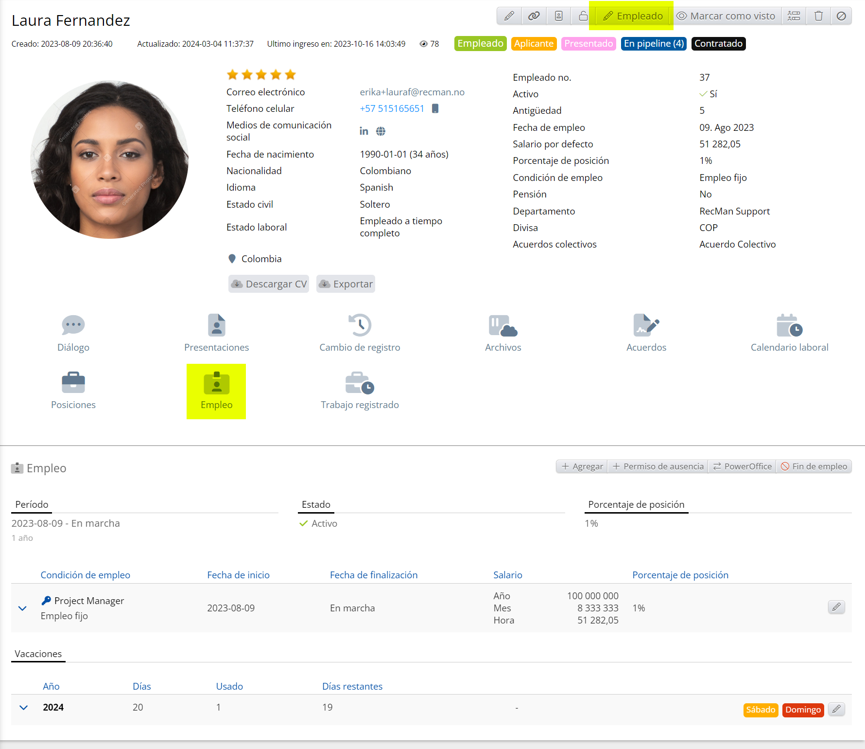 Cuando contratas a un candidato haciendo clic en Emplear, se te pedirá que completes la información relacionada con la relación laboral. Toda esta información se ingresará como nuevo empleo en la pestaña de Empleo.