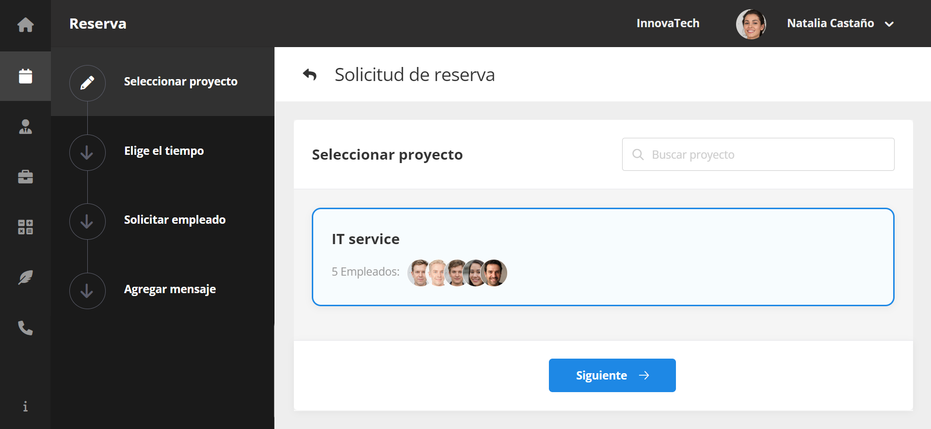 1) Elegir proyecto 2) Elegir horario 3) Solicitar empleado 4) Agregar mensaje