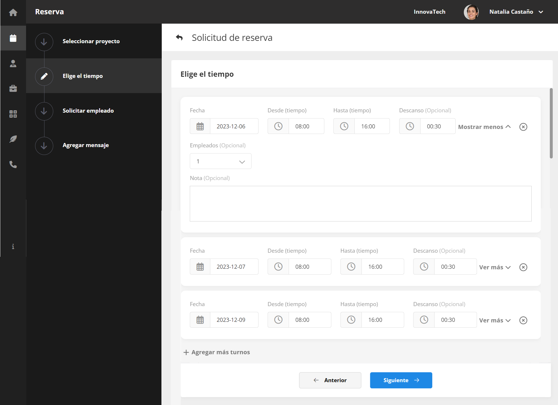 En el primer paso, elija el proyecto donde desea reservar empleados. En el segundo paso, puede agregar más turnos y aumentar el número de empleados (creando efectivamente múltiples turnos para la misma fecha). En el tercer paso, selecciona qué empleados solicitar según su disponibilidad establecida. Por último, puede incluir un mensaje sobre el turno si así lo desea.