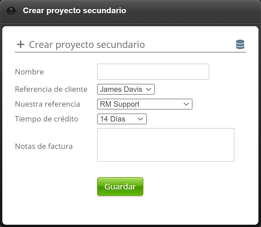 Los proyectos secundarios están asociados con el cliente y estarán disponibles en todos los proyectos para ese cliente. Sin embargo, deben agregarse individualmente para los empleados.