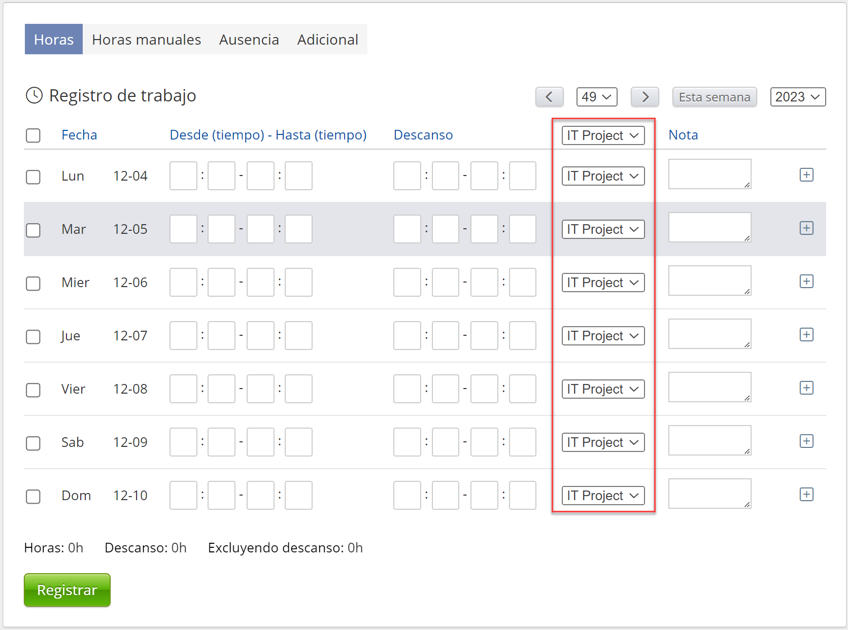 Cuando el empleado registra el trabajo, o usted registra el trabajo en nombre del empleado, tendrá la opción de elegir en qué subproyecto registrar el trabajo.