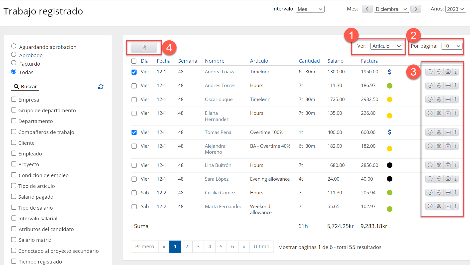 Al seleccionar En espera de aprobación, Aprobado o Facturado en el filtro, encontrará diferentes opciones al seleccionar filas. Lea más sobre esto a continuación.