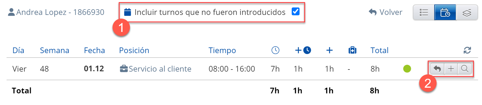 1. Marque esta casilla si desea incluir turnos no registrados del calendario de personal (las filas grises en la imagen de arriba).