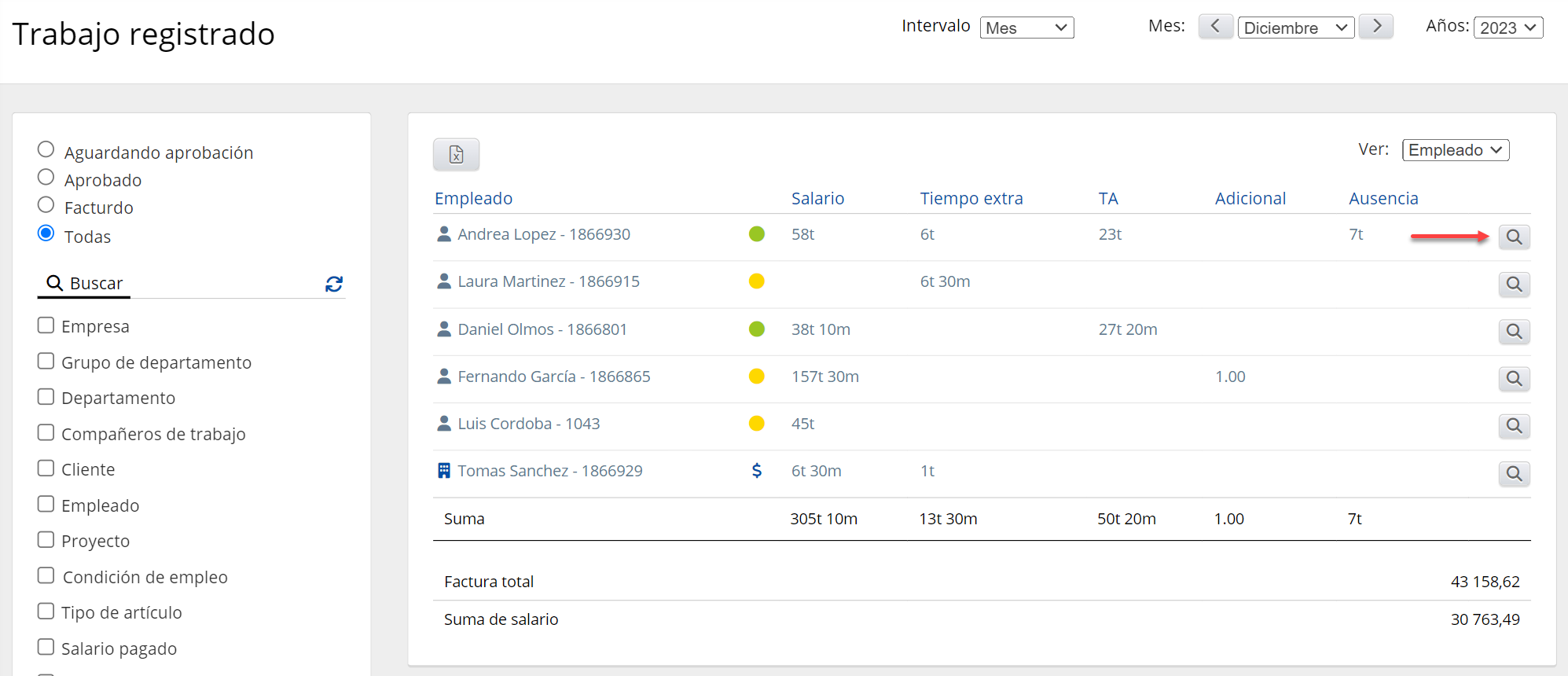 Esta vista agrupará todo el trabajo registrado por empleado y es la vista más informativa, repleta de funciones e interactiva de todas, lo que la convierte en la vista más utilizada en el trabajo registrado. Al aplicar filtros en el lado izquierdo y el punto en la parte superior, puede ajustar el contenido de muchas maneras para convertir el módulo de trabajo registrado en una herramienta poderosa para administrar el trabajo.