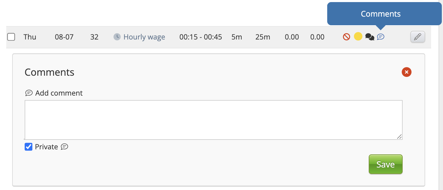 Los usuarios pueden elegir si un comentario está destinado a ser visto de forma pública o privada. Un comentario privado asegura que el comentario sea visible solo para usuarios internos, mientras que un comentario público puede hacerse visible para empleados (en el Portal de Empleados y la aplicación móvil) y personas de contacto (en el Portal de la Empresa).