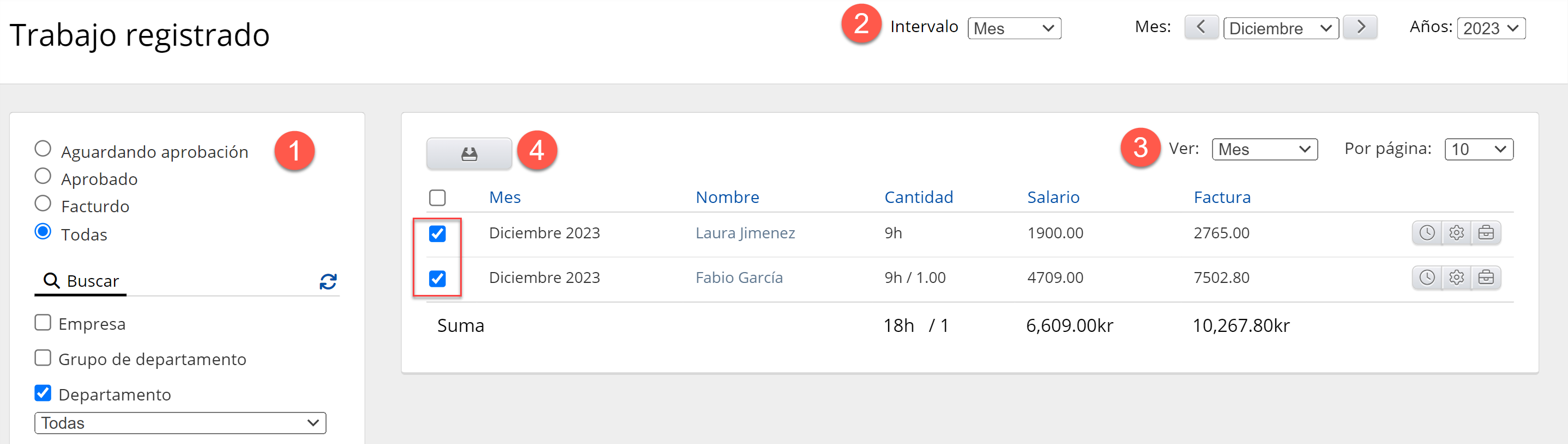 - Filtro: mediante el uso de filtros, puede encontrar el trabajo registrado en espera de aprobación, aprobado, facturado o todo lo anterior. A continuación, puede restringir la búsqueda con más filtros, como clientes y compañeros de trabajo.