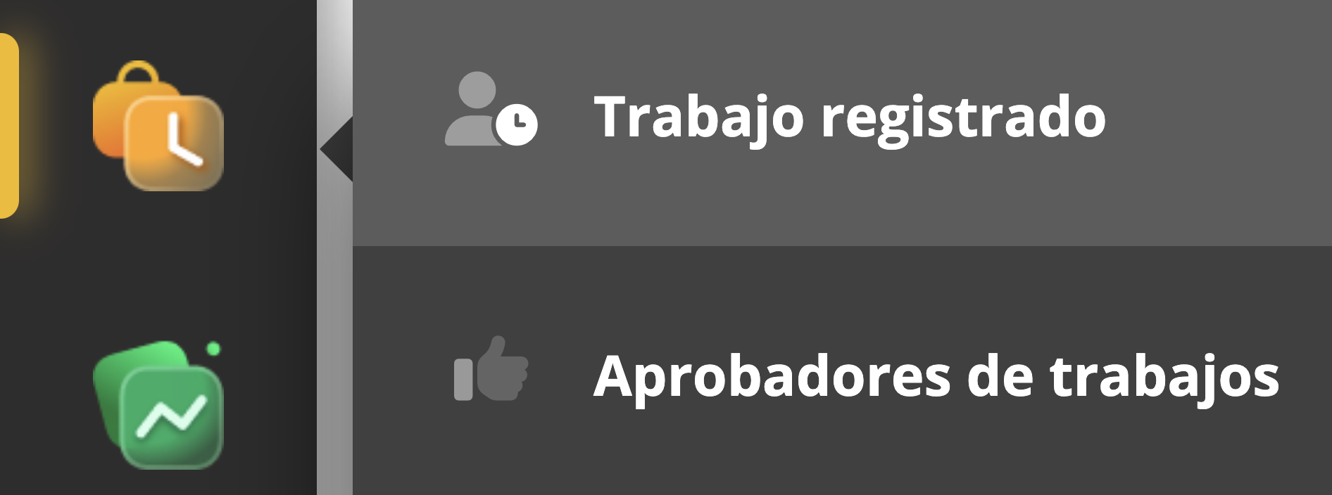 Para navegar a Trabajo registrado, use el menú del lado izquierdo como se ilustra a continuación. Otras formas son navegar desde la tarjeta de proyecto o una tarjeta de candidato, que además seleccionará los filtros relevantes.