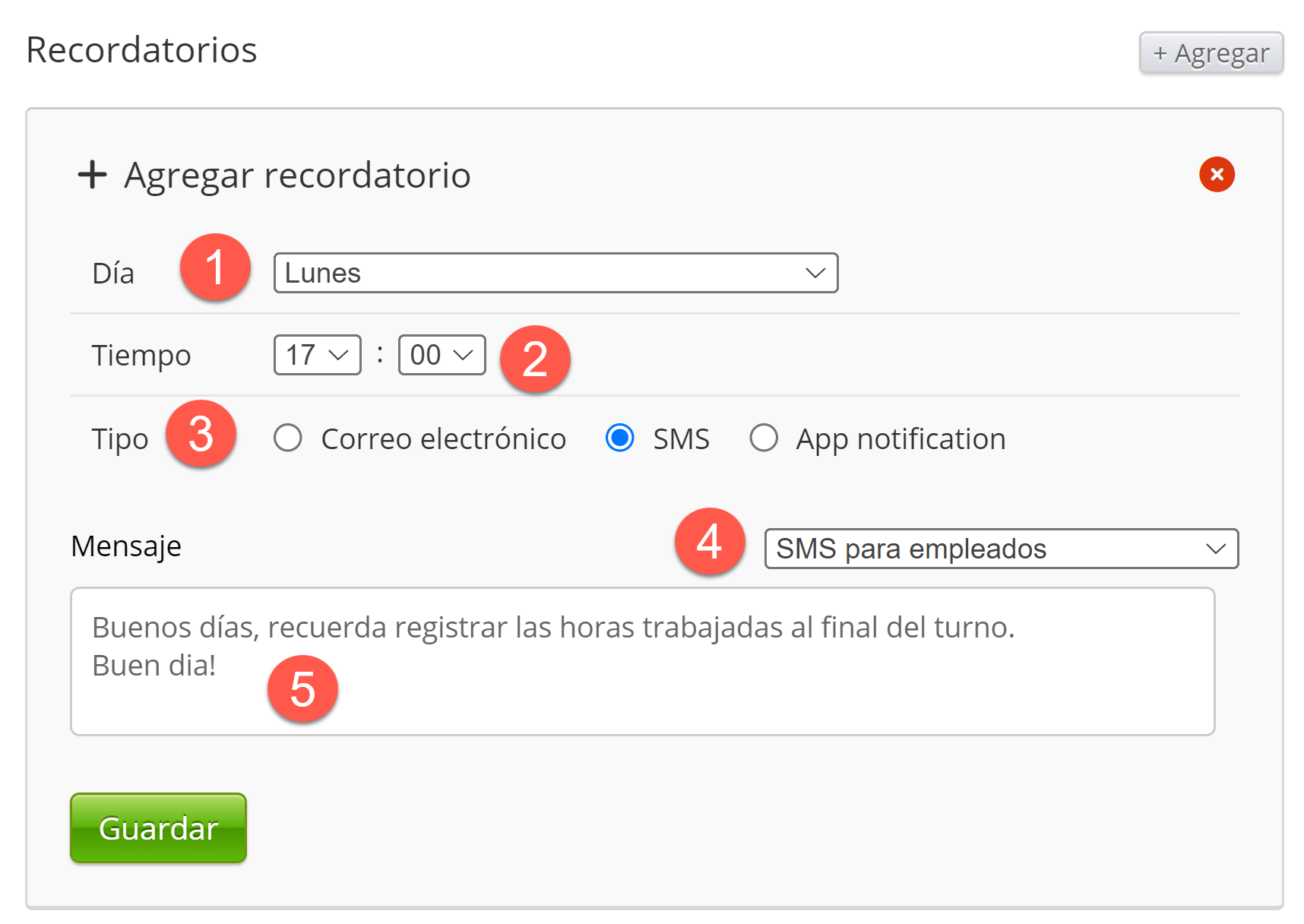 En la parte inferior del acuerdo colectivo, encontramos el campo de recordatorios. Aquí puede configurar rutinas fijas y automáticas para recordatorios SMS que se enviarán a los empleados adheridos al acuerdo colectivo.