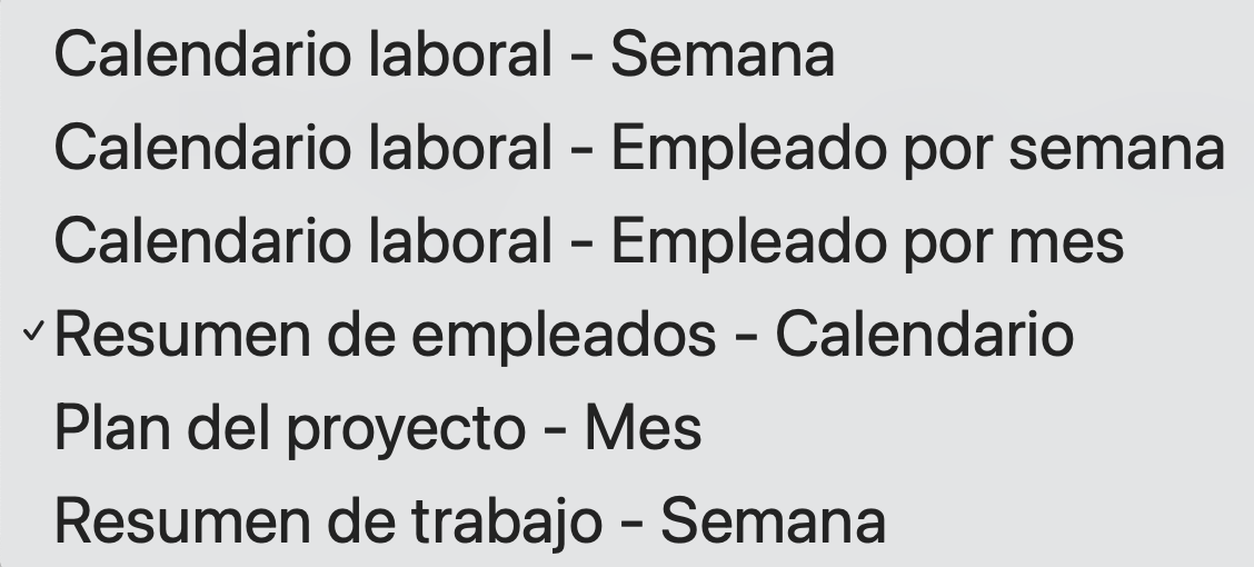 | Resumen de empleados - Calendario | Proporciona una descripción general de todos los empleados, si está disponible, si están en el trabajo, tienen un turno o si hay trabajo registrado, etc. | Resumen de empleados |