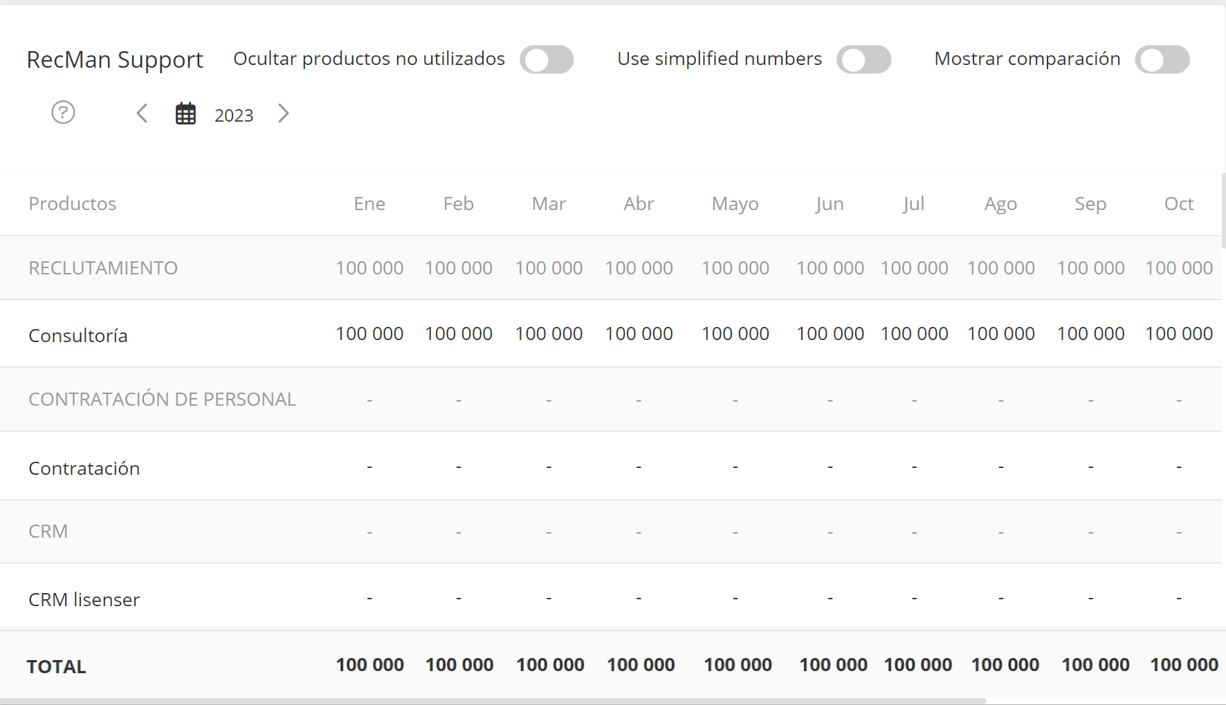 El presupuesto se puede definir individualmente para cada mes o ingresar un valor predeterminado para todo el año. Con el presupuesto ingresado, se puede usar el control deslizante Ocultar productos no utilizados para eliminar las filas sin ningún dato y/o usar números simplificados para una visualización más sencilla.