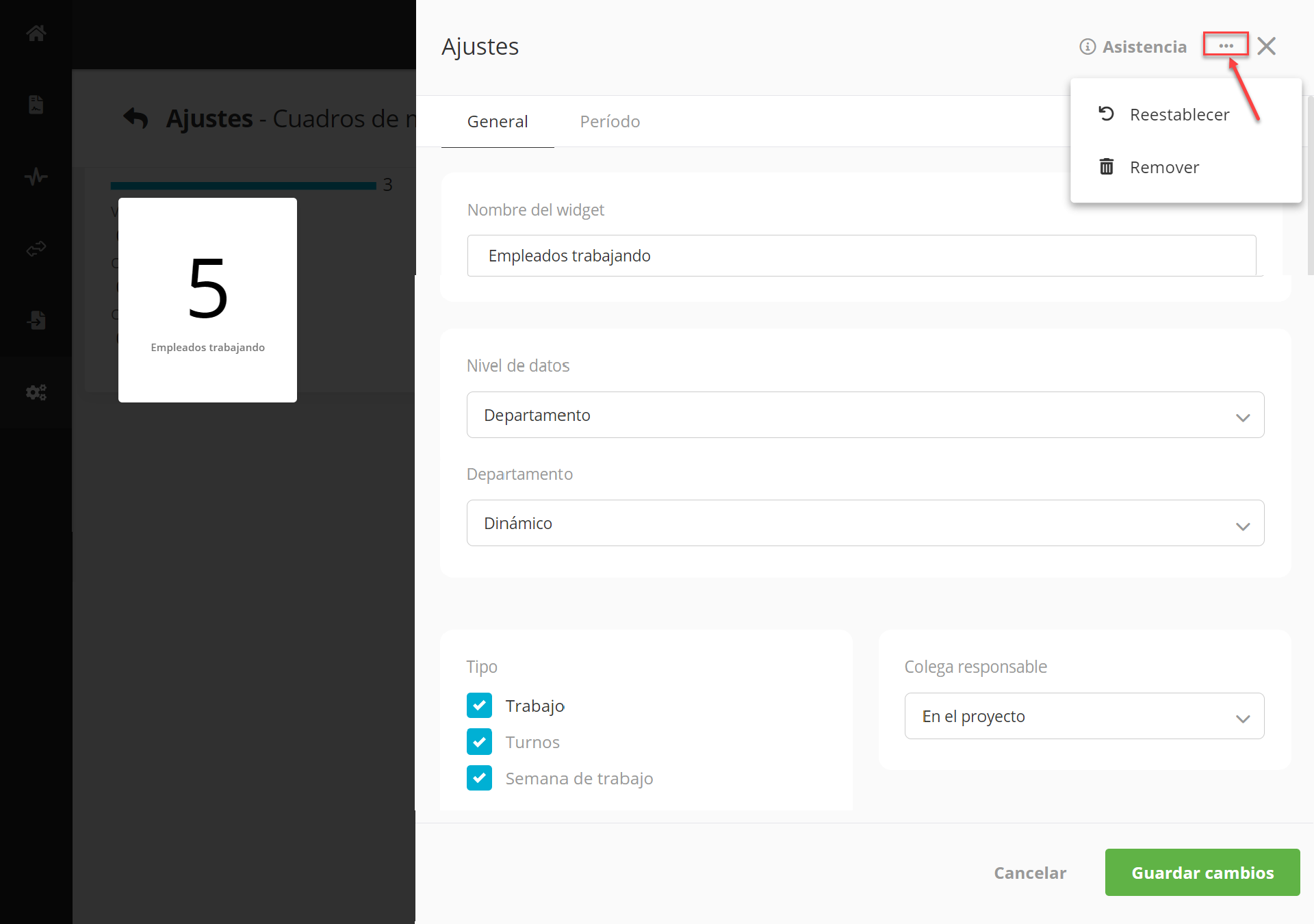 Una vez que agregue un nuevo widget, la configuración del widget estará predefinida. Recomendamos acceder a esta configuración a través del botón de tres puntos en la esquina superior derecha del widget para personalizarlo aún más según sus necesidades específicas. Además, puede ajustar el tamaño del widget haciendo clic en la esquina inferior derecha.