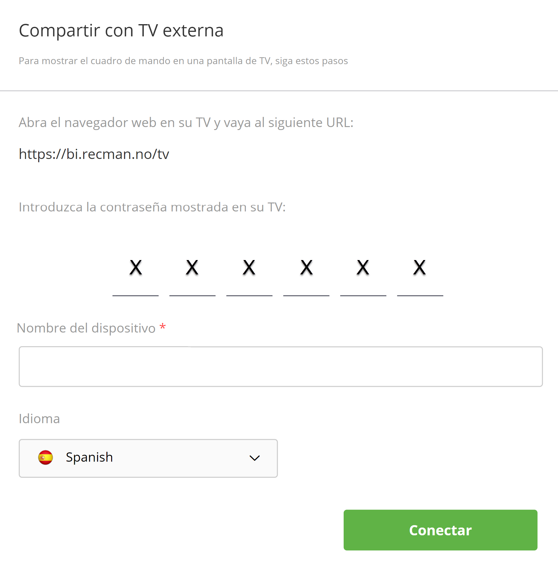 Desde la función para compartir TV dentro de RecMan BI, ingrese el número de 6 dígitos cuando se conecte a su TV.