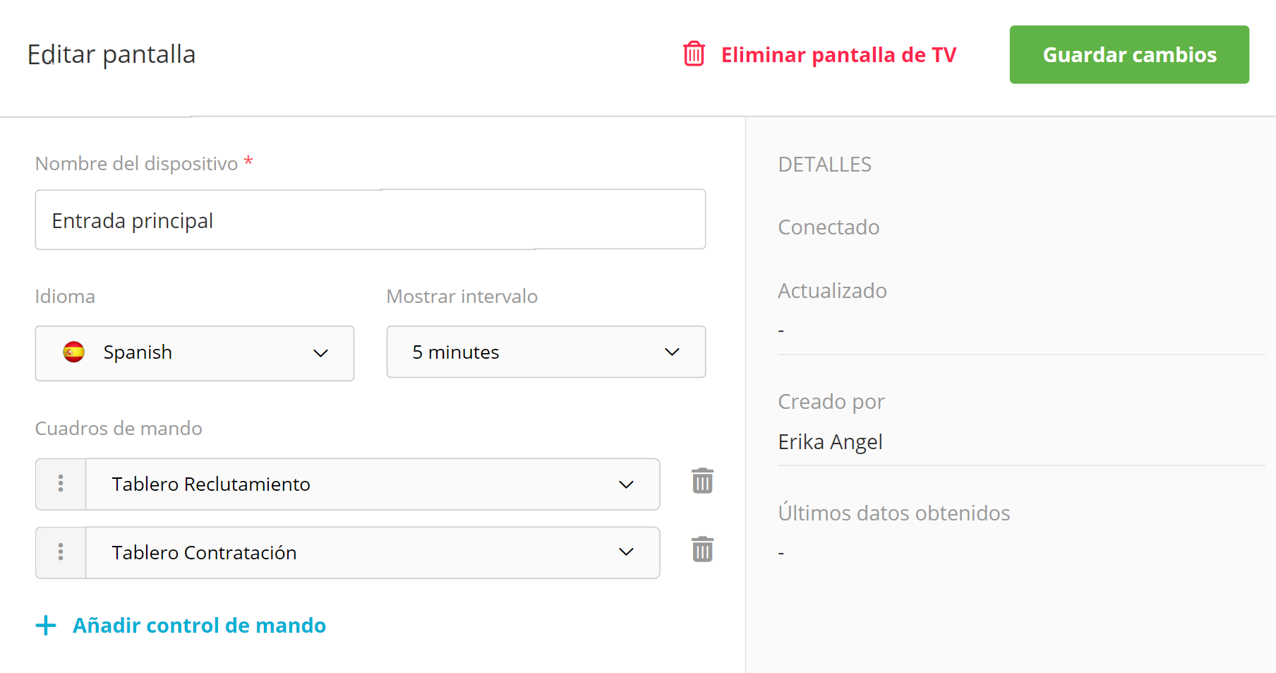 Tan pronto como haya establecido una conexión, podrá seleccionar qué tableros se mostrarán en el televisor. Puede agregar más de uno y especificar el intervalo de tiempo en el que se mostrará el siguiente tablero.