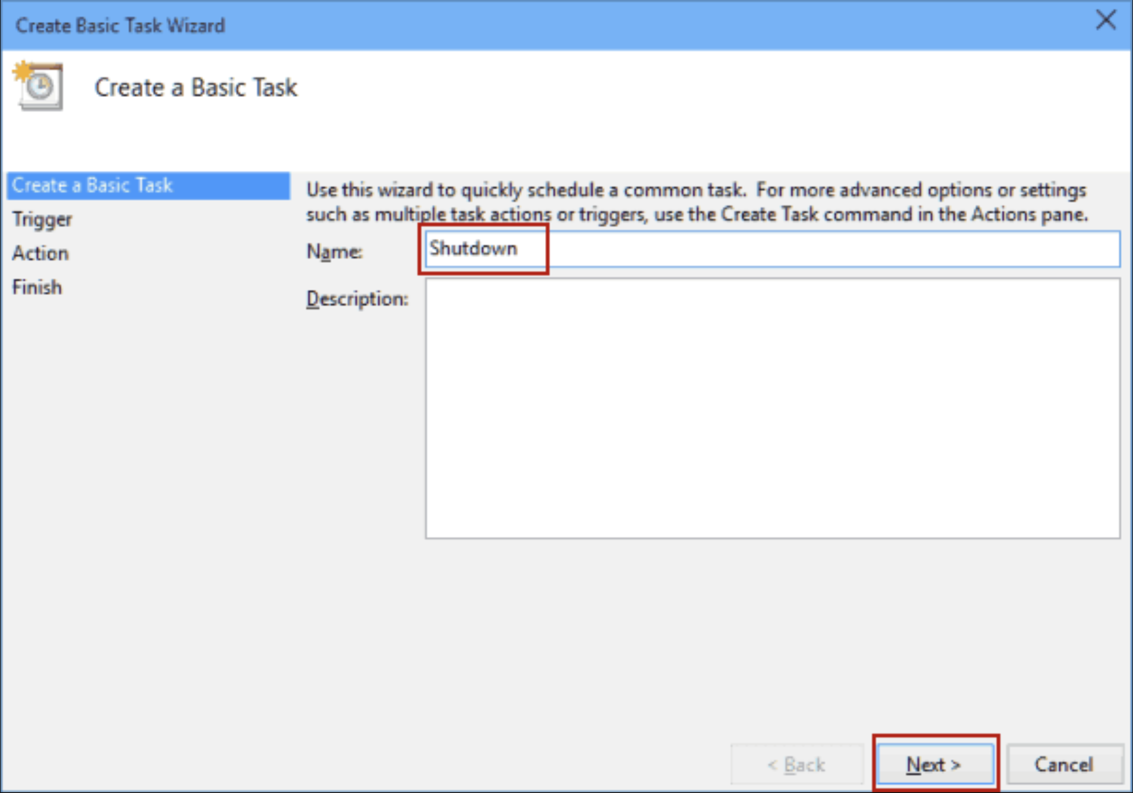 - Ingrese el nombre para su tarea, por ejemplo, "Apagado".