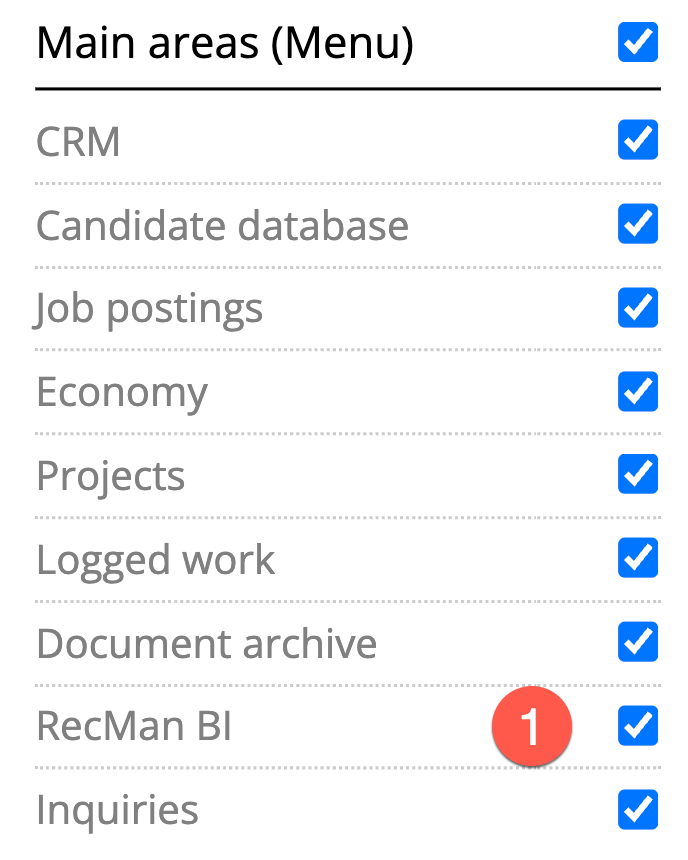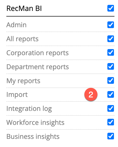 Para acceder a RecMan BI y utilizar la función de importación, necesita tener los permisos habilitados en la configuración de compañeros de trabajo, como se muestra a continuación. El primer permiso otorga acceso a la aplicación RecMan BI, donde puede estar ubicada la función de importación, y el segundo, al módulo de importación.