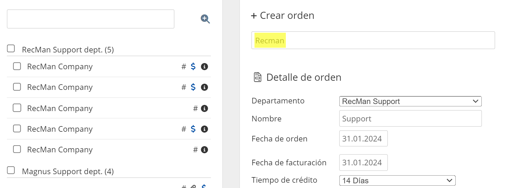 En caso de que el usuario elija el nivel de datos Corporación, entonces la lista de pedidos se mostrará según los departamentos que se eligieron al crear un pedido. Cada departamento está conectado a una corporación específica. Después de filtrar los clientes facturados, se verificarán todos los departamentos que están conectados a la corporación elegida desde la configuración del widget.