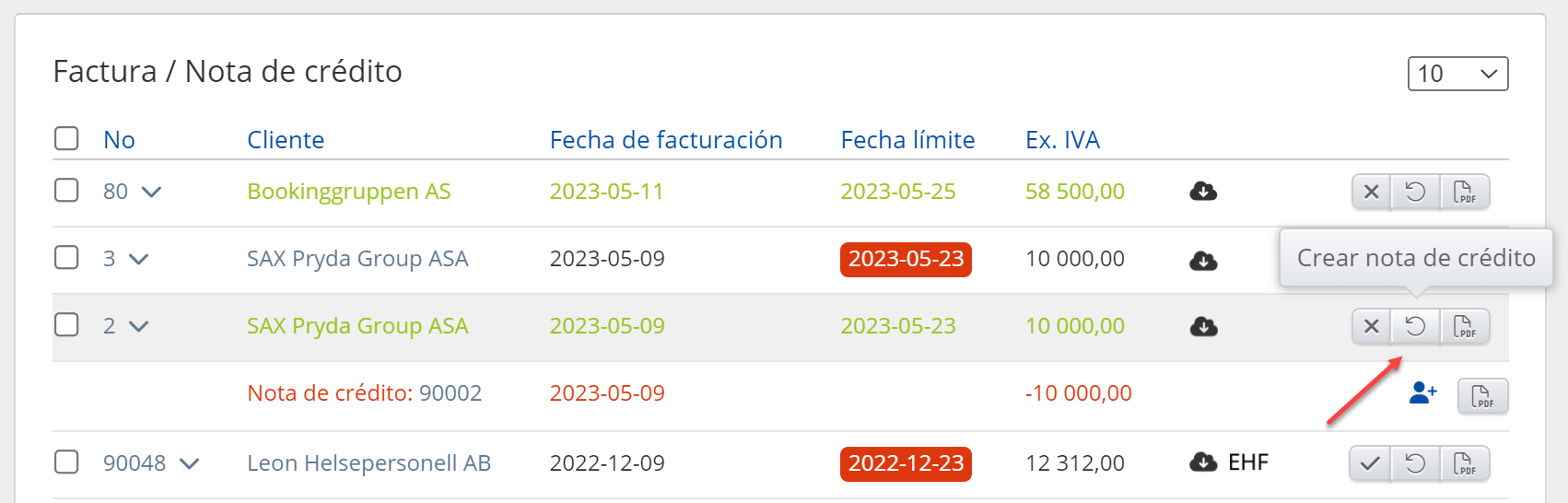 La vista detallada del cajón contiene información sobre los clientes y las facturas: