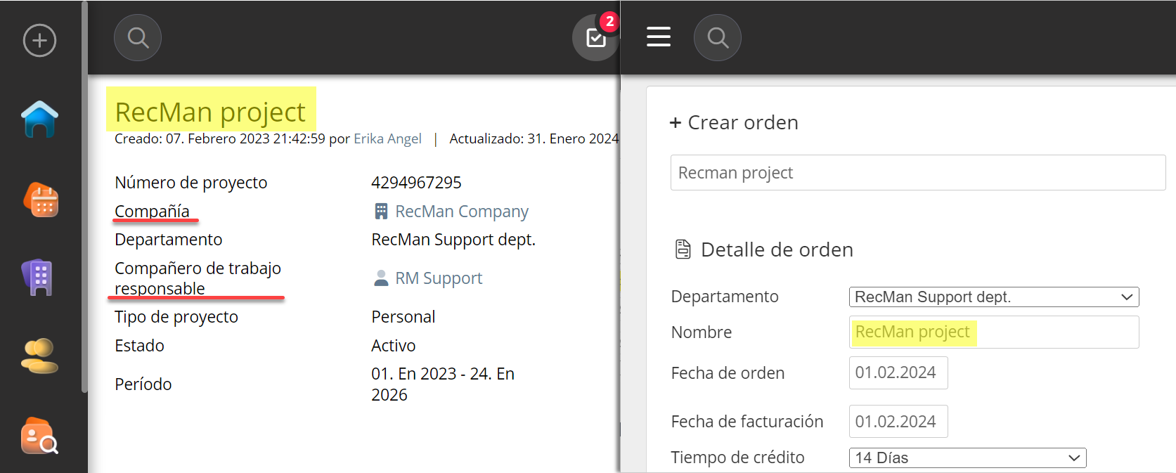 En caso de que el usuario elija el nivel de datos Compañero de trabajo, entonces la lista de pedidos se mostrará según el compañero de trabajo responsable del proyecto que se eligió al crear el pedido.