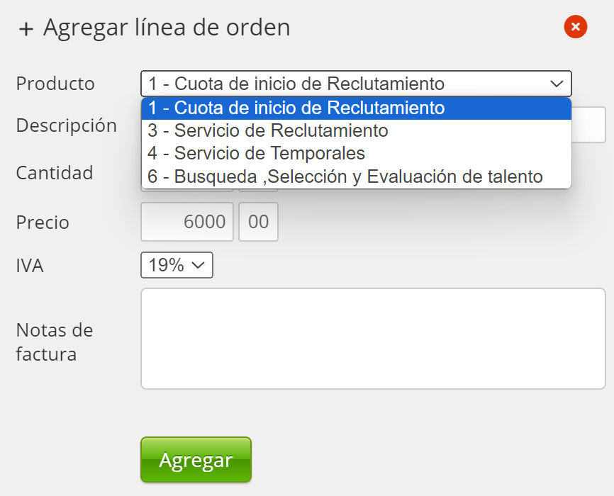 - Sección 'Productos': lista desplegable:
