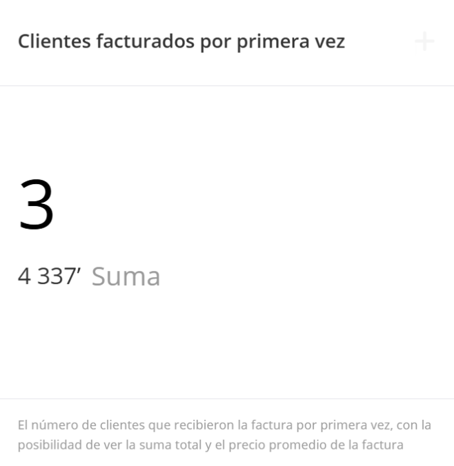El widget muestra el número de clientes que recibieron una factura por primera vez, con la posibilidad de ver la suma total y el precio promedio de la factura.
