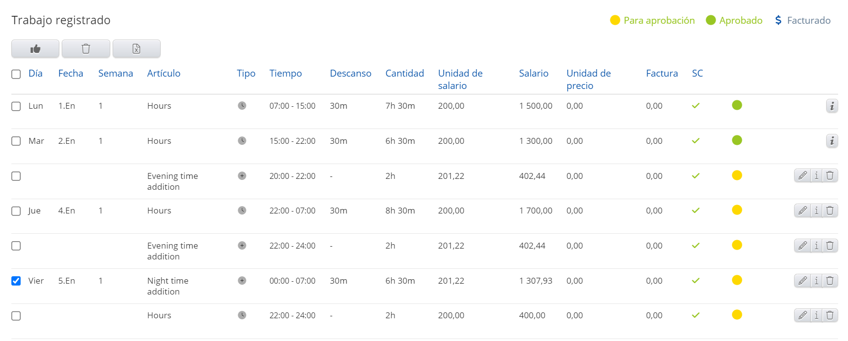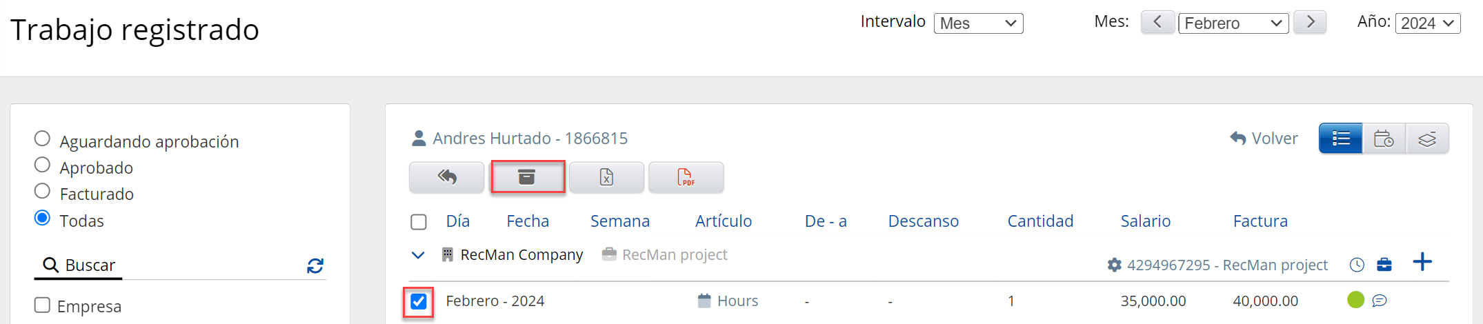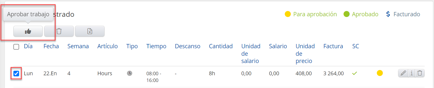 Para registrar el tipo Asalariado, apruebe el trabajo registrado para un empleado, abra la página de "Trabajo registrado", marque el trabajo aprobado y haga clic en el botón Marcar como facturado.