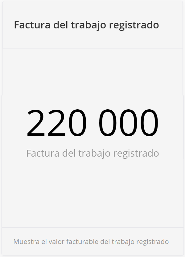 Este widget es bastante similar al widget de salario por trabajo registrado. La diferencia es que este widget muestra el valor de las facturas. El usuario puede agregar algunos candidatos como empleados para algunos trabajos del proyecto. Estos empleados pueden registrar su trabajo y, según el trabajo registrado, recibir un salario. Hay varios tipos de trabajo registrado: Horas, Ausencia, Adiciones, Trabajo a destajo, Pago diario, Pago mensual, Horas extras, Adiciones en tiempo, Ausencia autogestionada y Recibos. Además, el trabajo puede estar aprobado, esperando a ser aprobado y facturado.