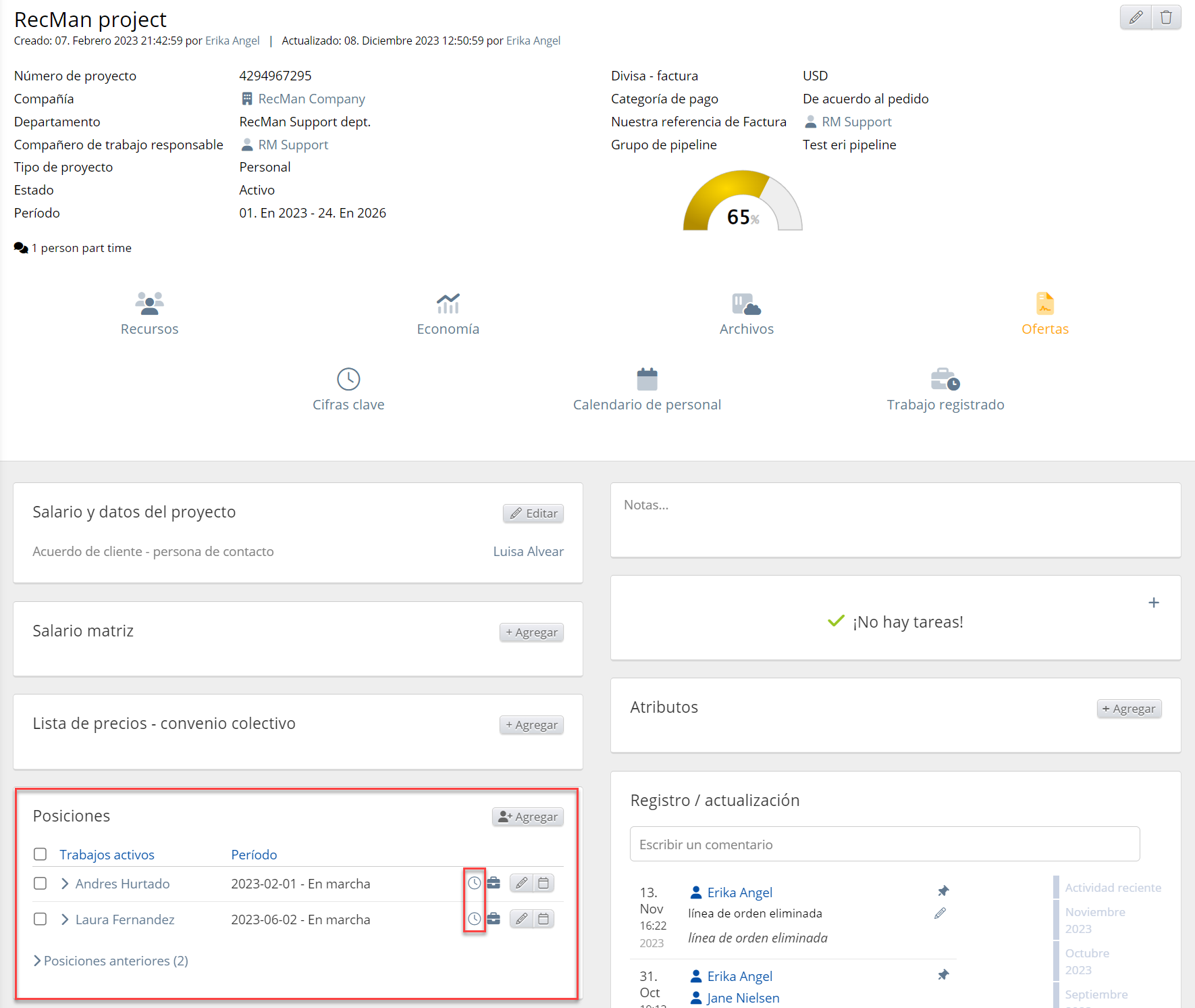 Este widget muestra los salarios por el trabajo registrado de los empleados. El usuario puede agregar algunos candidatos como empleados para algunos trabajos del proyecto. Estos empleados pueden registrar su trabajo y, según el trabajo registrado, recibir un salario. Hay varios tipos de trabajo registrado, como Horas, Ausencia, Adiciones, Trabajo a destajo, Pago diario, Pago mensual, Horas extras, Adiciones en tiempo, Ausencia autogestionada y Recibos. Además, el trabajo puede estar aprobado, esperando a ser aprobado y facturado.