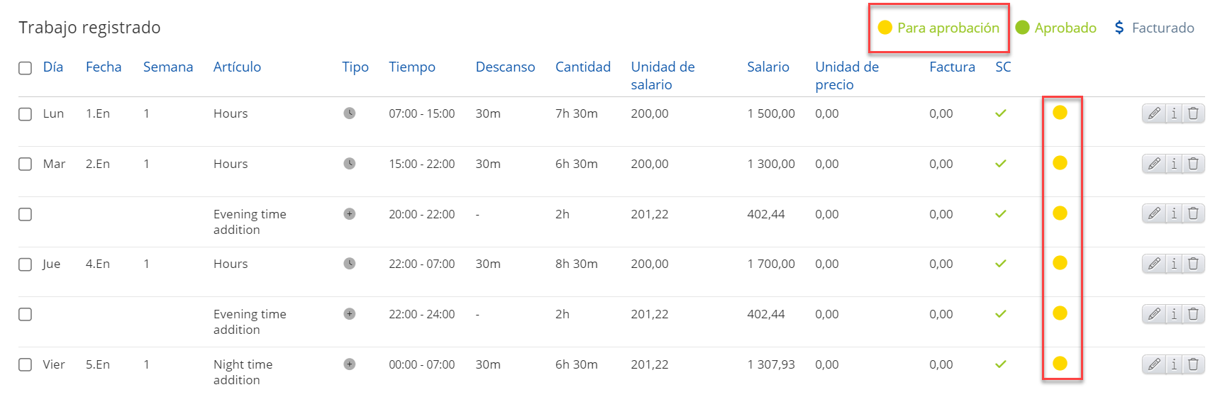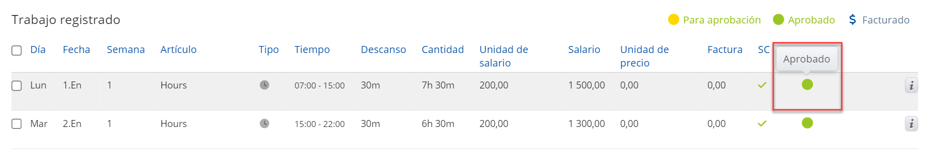 - Casillas de verificación de estado laboral: Por aprobar, Aprobado, Facturado.