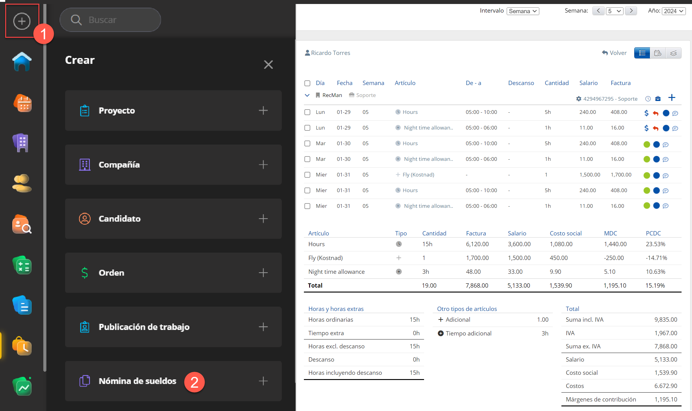 - Artículos: Horas, Ausencia, Adiciones, Deducciones, Trabajo por unidad, Pago diario, Pago mensual, Horas extras, Adiciones en tiempo, Salario garantizado, Adición al salario garantizado, Ausencia autogestionada, Recibo