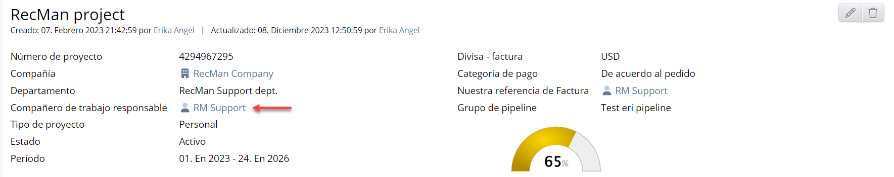 Si el usuario elige el nivel de datos Compañero de trabajo, entonces la factura por trabajo registrado se contará según el compañero de trabajo responsable del Proyecto donde está presente el Trabajo con empleados.