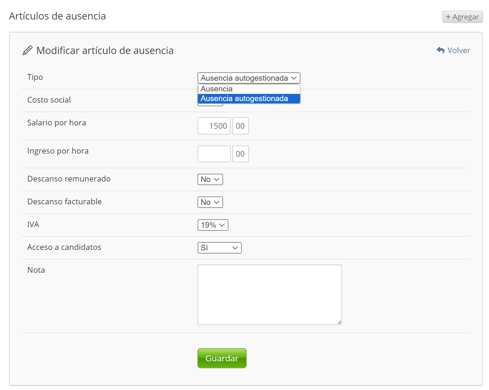 La Ausencia se puede establecer aquí. Cuando se establecen las ausencias, los candidatos verán estas opciones y podrán registrarlas. Los usuarios también pueden establecer el tipo de ausencia, ya sea una ausencia simple o autogestionada.
