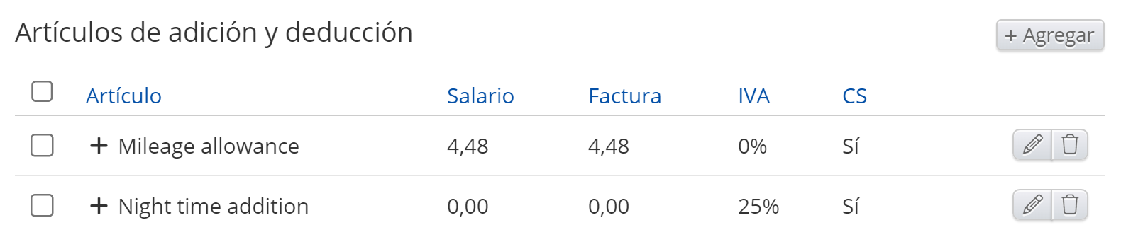 - Artículos - Salario regular, Horas normales, Ausencia, Adiciones, Deducciones, Trabajo por unidad, Pago diario, Pago mensual, Horas extras, Adiciones de tiempo, Salario garantizado, Adición de salario garantizado, Ausencia autogestionada, Recibo