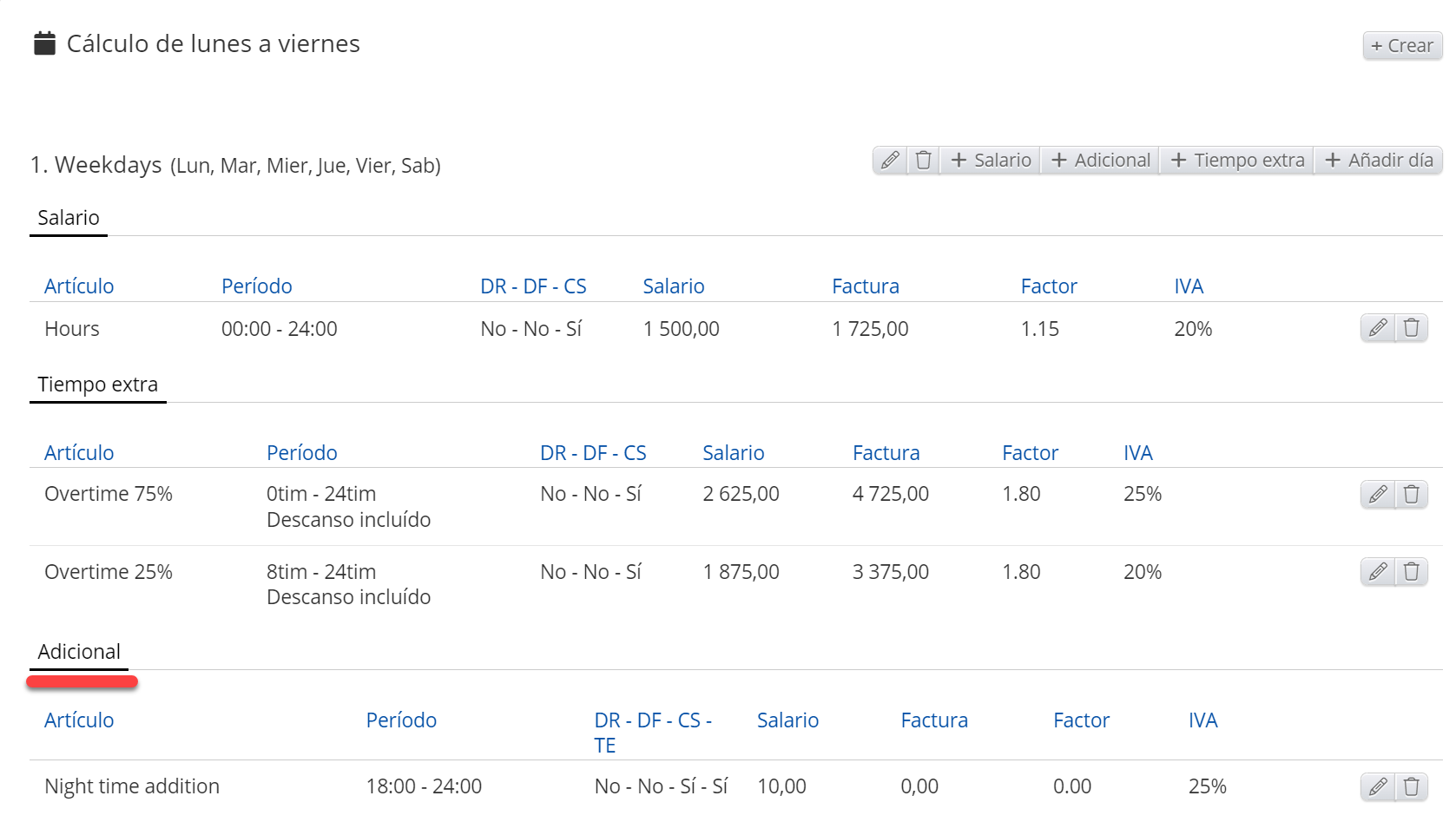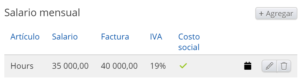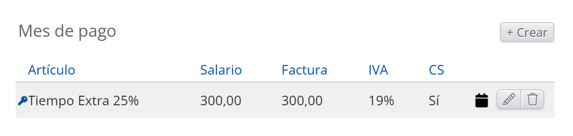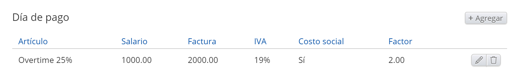 - Artículos: Salario regular. Horas normales, Ausencia, Adiciones, Deducciones, Trabajo por unidad, Pago diario, Pago mensual, Horas extras, Adiciones en tiempo, Salario garantizado, Adición al salario garantizado, Ausencia autogestionada, Recibo