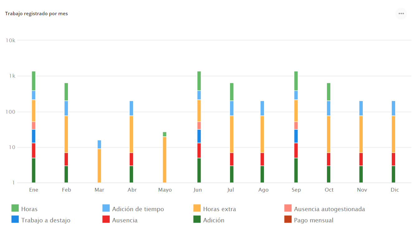 Este widget muestra el trabajo registrado por empleados con diferentes tipos de artículos y muestra los datos para un año por mes, de enero a diciembre. Registra cada artículo por empleados presentes en el widget como la cantidad de cada artículo (un artículo registrado por un día se mostrará como un valor "1" en el gráfico del widget) y el número total en cada mes registrado por cada empleado agregado al proyecto seleccionado; todos los artículos tienen su propio color. Los tipos de artículos son: Salario, Ausencia, Adición, Deducción, Salario por trabajo por unidad, Pago diario, Pago mensual, Horas extras, Adición en tiempo, Salario garantizado, Adición al salario garantizado, Ausencia autogestionada, Recibo.
