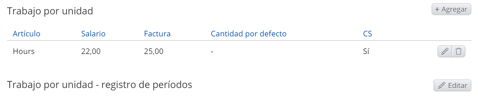 - Artículos: Salario regular, Horas normales, Ausencia, Adiciones, Deducciones, Trabajo por unidad, Pago diario, Pago mensual, Horas extras, Adiciones de tiempo, Salario garantizado, Adición de salario garantizado, Ausencia autogestionada, Recibo