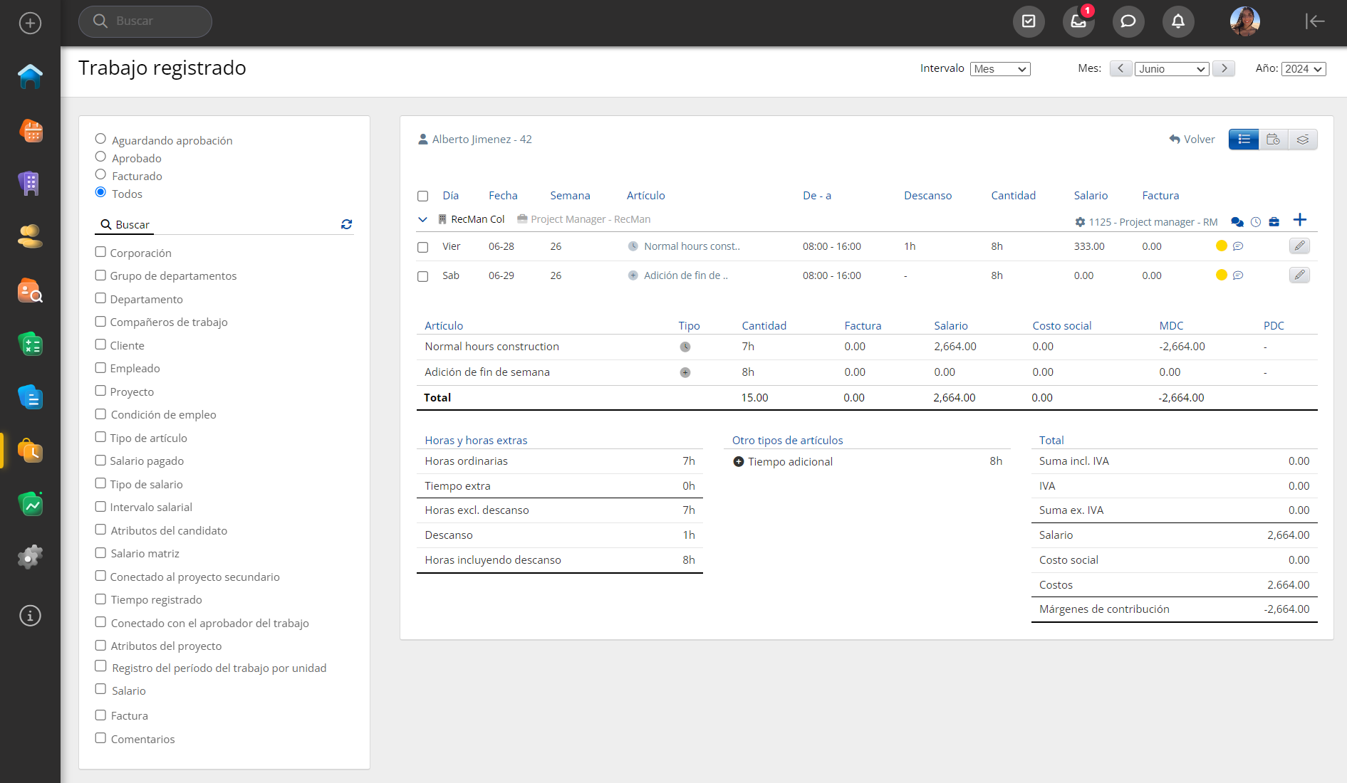 Para registrar el salario para el tipo de estado laboral Para Aprobación, registre cualquier artículo para su empleado en el proyecto activo, las horas de trabajo y el salario registrados estarán presentes en la tabla Trabajo registrado (Proyecto - Registrar trabajo), espere hasta que los datos se carguen en el widget.