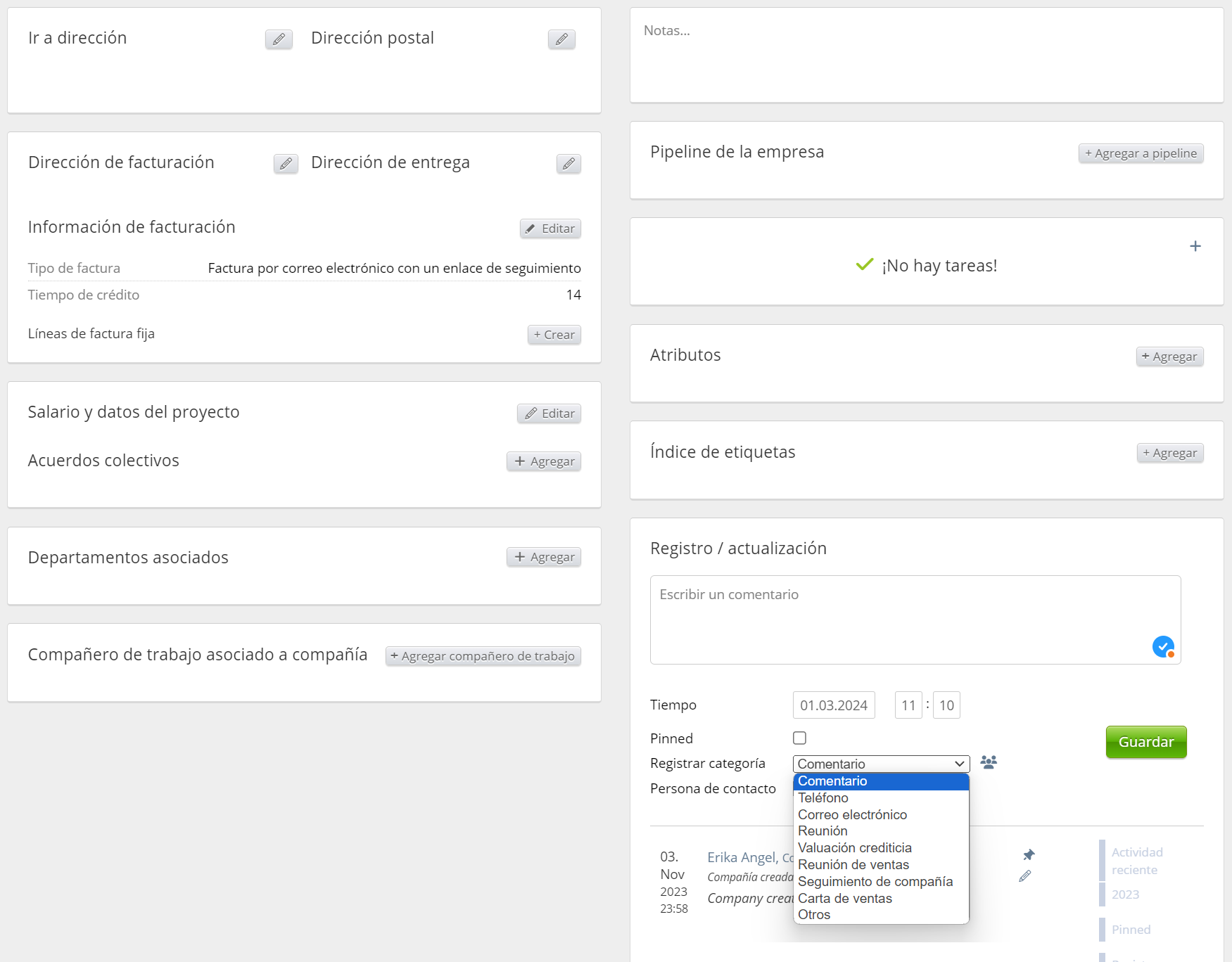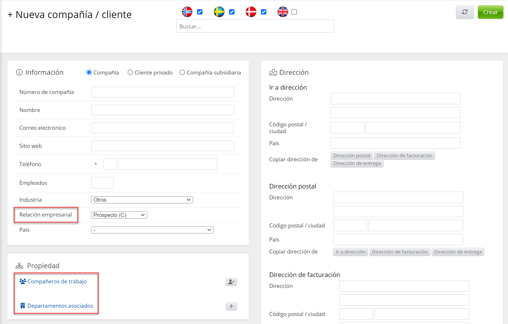 - Relación de la empresa (casillas de verificación): Cliente (A), Cliente reciente (B), Prospecto (C), Sospechoso (D), Cliente perdido, Bancarrota, Subcontratista, Socio, Proveedor, Competidor, Propia empresa, Freelance, No aplicable y Otro