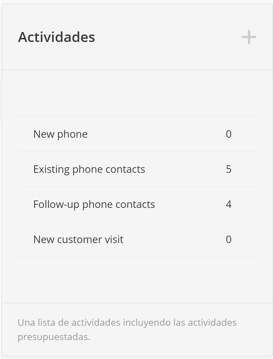 Este es un widget de lista. Este widget muestra la cantidad de actividades de los usuarios. Además, el widget muestra el presupuesto, el cual se puede añadir a una actividad particular desde el módulo de Presupuesto de Actividades en el sistema BI. En el widget se muestran 3 columnas: