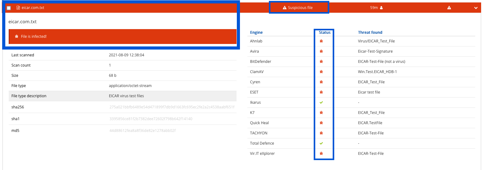 Tipos de amenazas: Infectadas, Sospechosas, Fallidas, Archivo encriptado, Documento protegido con contraseña, Desajuste de tipo de archivo.