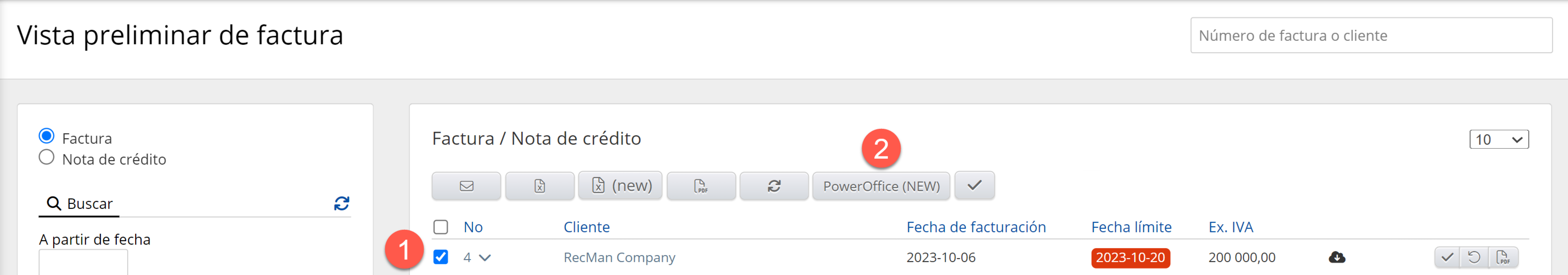 Exportar factura o nota de crédito de RecMan a PowerOffice