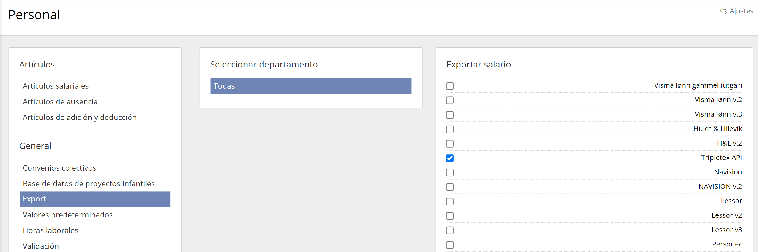 Para activar la integración de la API de Tripletex para la exportación de salarios, vaya a Configuración del sistema → Personal → Exportar y marque la API de Tripletex.