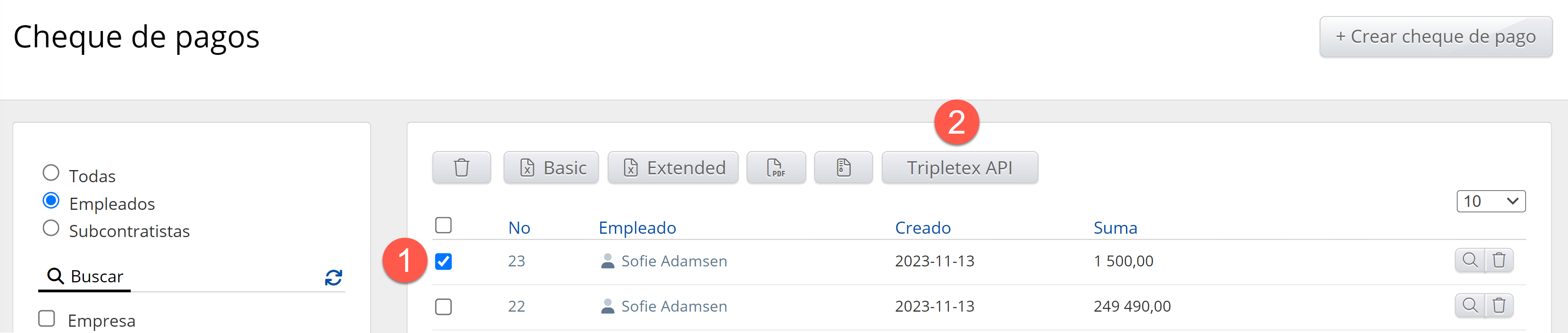 La exportación de salarios a la API de Tripletex ya está disponible en el sistema. Para exportar a la API de Tripletex, vaya a la pantalla Cheques de pago, resalte uno o más artículos y presione el botón API de Tripletex que aparece en la parte superior. Al hacer esto, los registros de tiempo, los artículos y los empleados se transfieren automáticamente a Tripletex.