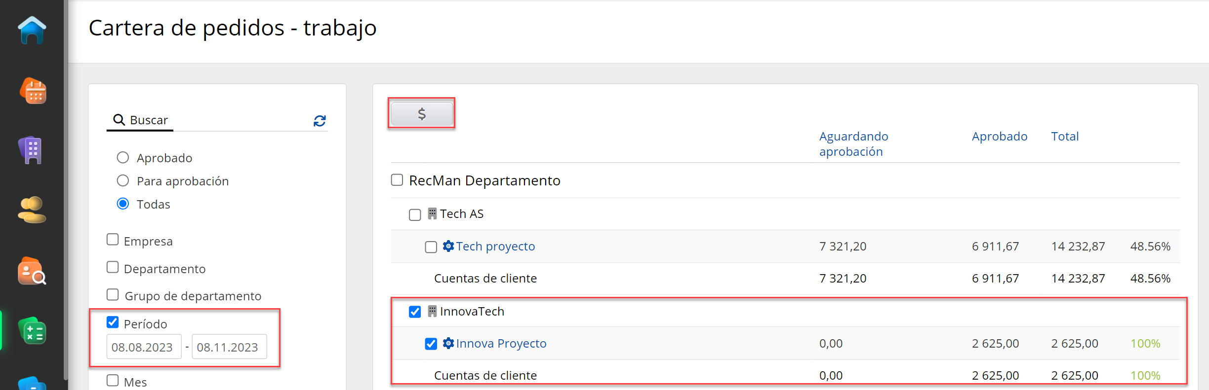En Cartera de pedidos - trabajo, puede aplicar un filtro para ver solo las horas relevantes, entre otras cosas, un período. En el siguiente ejemplo, vemos todo el trabajo realizado entre el 08.08.2023 y el 08.11.2023.