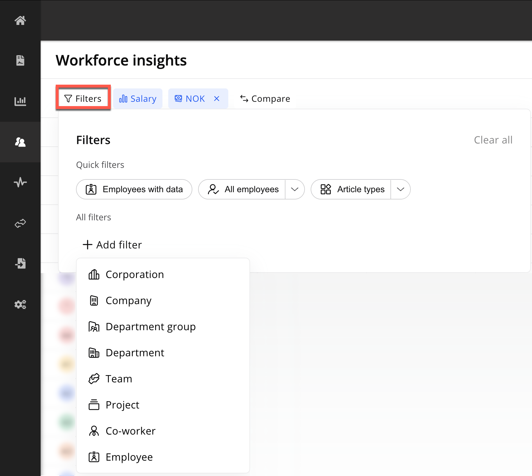 Todos los filtros: Corporación, Empresa, Grupo de departamentos, Departamento, Equipo, Proyecto, Compañero de trabajo o elegir un Empleado en particular.