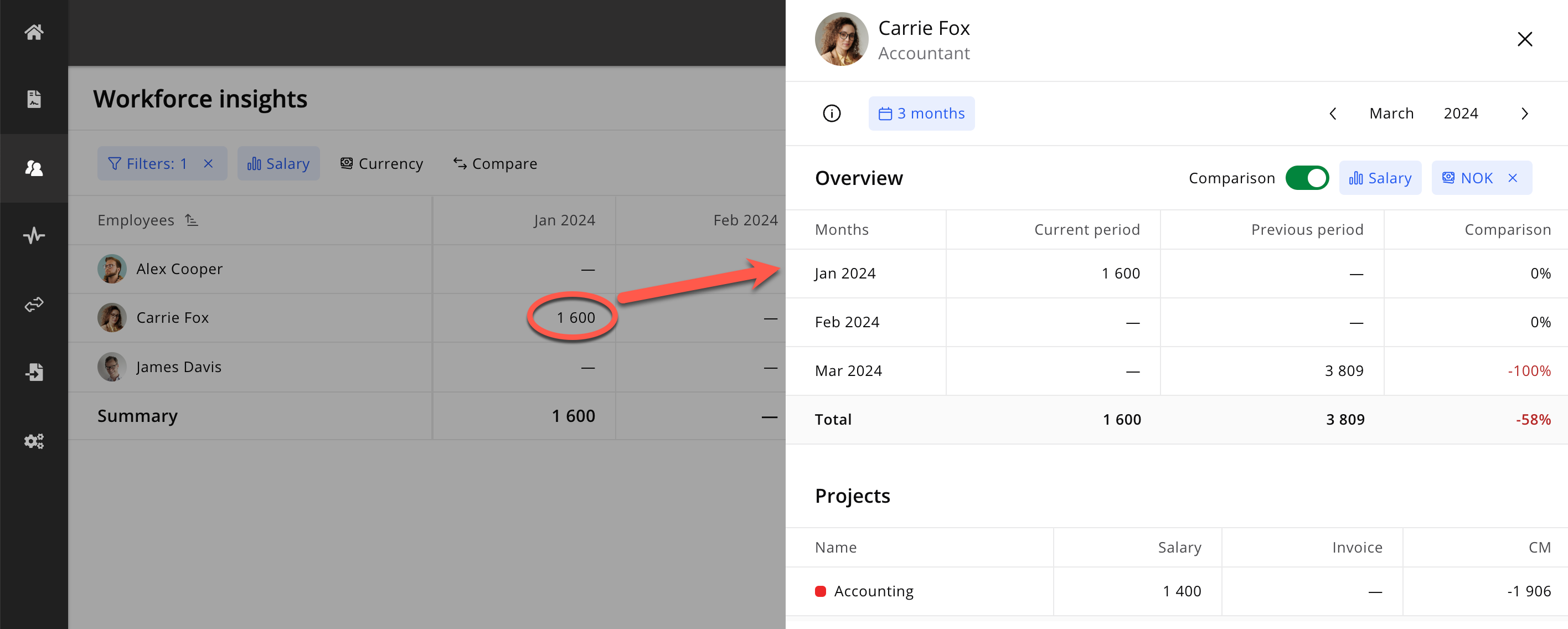 Ciertos elementos, como datos específicos en la hoja de cálculo, son clicables. Al hacer clic en ellos, se proporcionará información más detallada en un formato de panel derecho. Puede comparar métricas de rendimiento, como horas registradas, margen de contribución, etc., con las del año anterior.