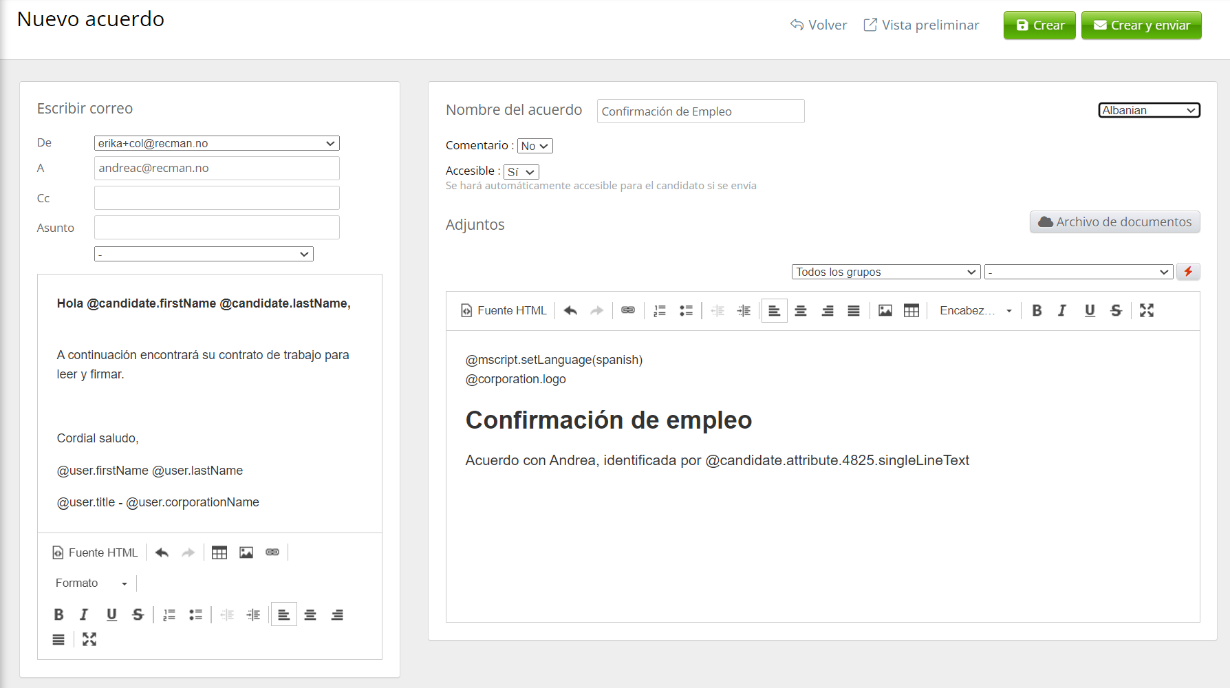La fusión de información de atributos se puede utilizar de diversas maneras. Por ejemplo, si tiene un atributo de candidato con un campo de texto y desea referenciarlo en un acuerdo, puede simplemente obtener la información con la etiqueta de fusión @candidate.attribute.XXX.text, y el texto se incluirá en su acuerdo.