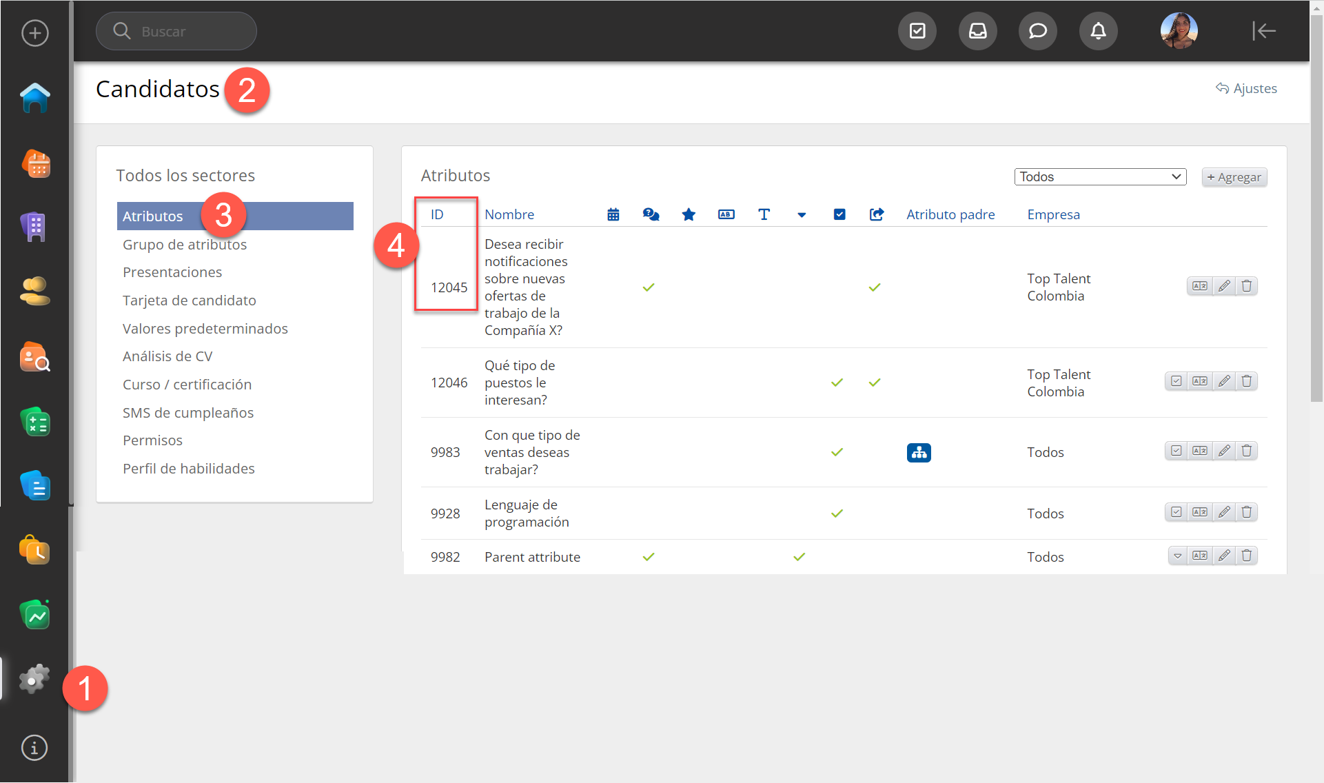 ID del atributo: creado automáticamente por el sistema cuando el atributo se añade en Configuración del Sistema → Candidatos, CRM o Proyectos → Atributos